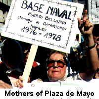 A group of women who became a symbol of human rights activism and courage. Dressed in black, they have been demonstrating for years every Thursday at 3:30 in the afternoon, in the famous Plaza de Mayo in Buenos Aires, demanding to know the fates of their loved ones. Marching around the statue of liberty, in front of the presidential palace, they used to tie white hadkerchiefs imprinted with names of disappeared sons and daughters, around their heads, and carry signs emblazoned with photographs of those about whose destinies they sought information. The Mothers' use of the imagery of Christian motherhood made them particularly effective against the professedly Catholic military regime.