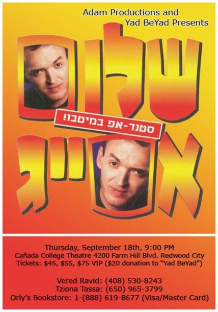 Shalom Asayag, stand-up comedy at its best. Speaks about life in Israel, the cell phone epidemic, women and men, relationships, Israeli politics, Israeli singers and current events