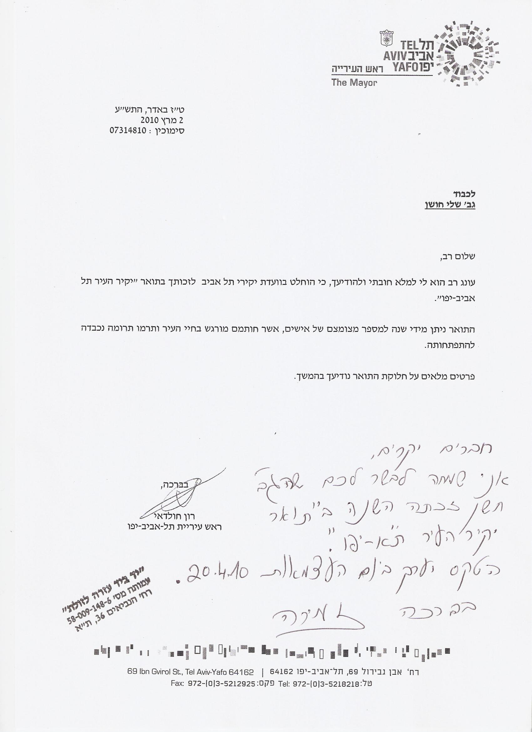 I am pleased to inform you that Mrs. Shely Hoshen, the "Yad BeYad" founder and international President was lately nominated for the "Tel Aviv Honor Award" which she will receive on April 20th, on Israel Independence Day! Please see the attached letter from Tel Aviv Mayor, Mr. Huldai.
